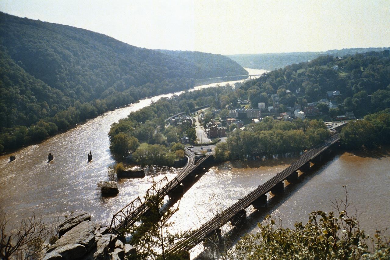 Potomac river flowing under the railway junction (main line on the right, Winchester Branch on the left), and the Shenandoah river joining up. Here's a related website. {04-09E34} Harper's Ferry |