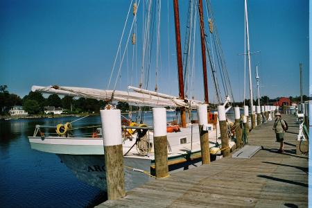 The Argia, a replica 19th c. schooner.This was our conveyance for an idyllic sunset cruise later that day after we looked around the fascinating ancient seaport. {04-Su10A39} Mystic Seaport, CT |