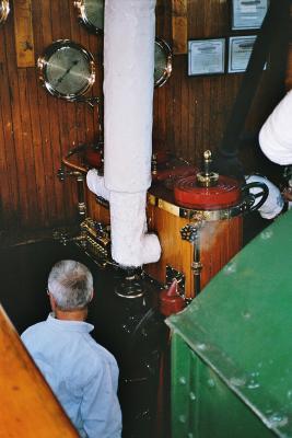 The engine room of the Sabino - they say it is the only coal-fired passenger-carrying steamboat in operation (in USA?). {04-Su10B15} Mystic Seaport, CT |